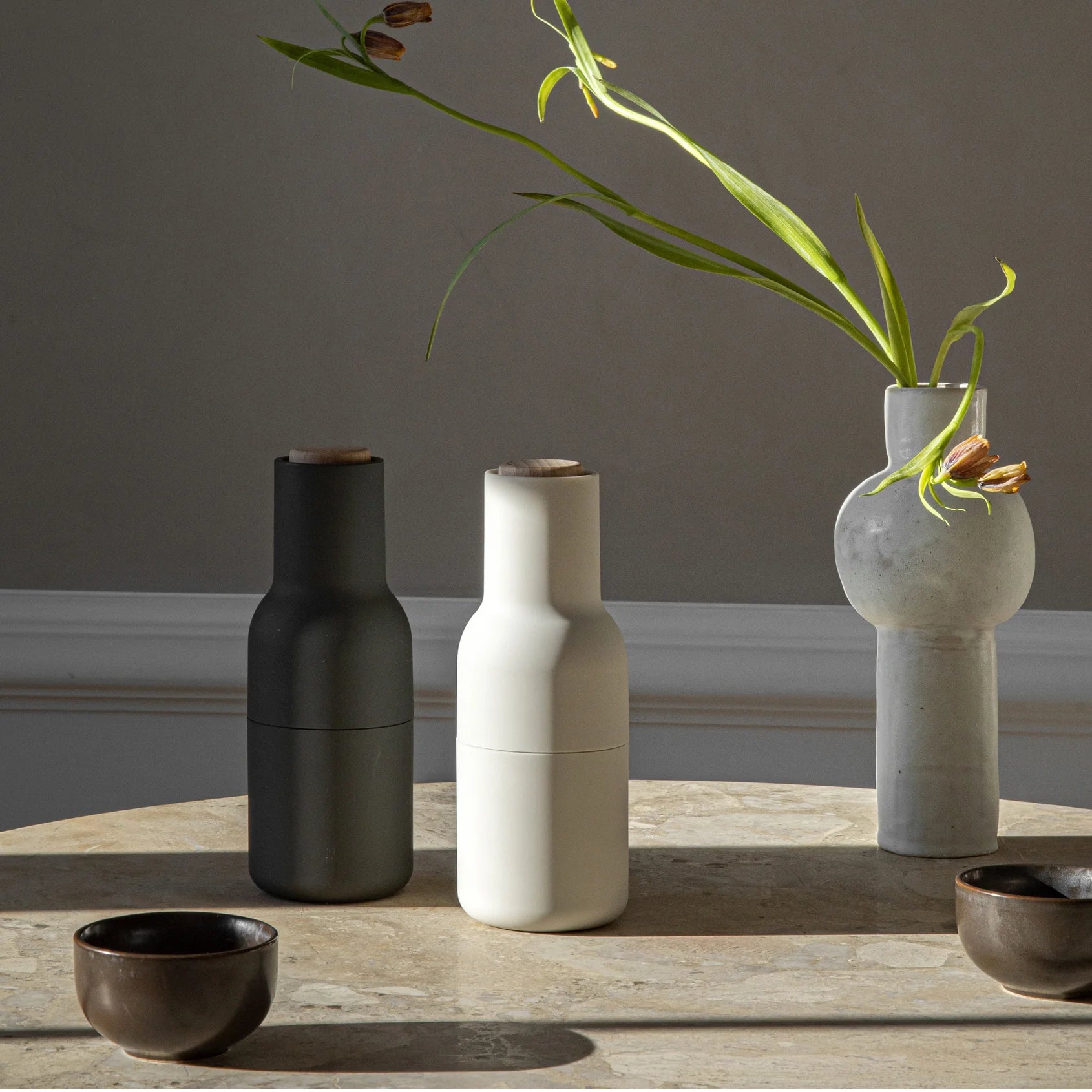 Audo Copenhagen Salt & Pepper Bottle Grinders, Ash & Carbon w/ Walnut Lids, 8" H