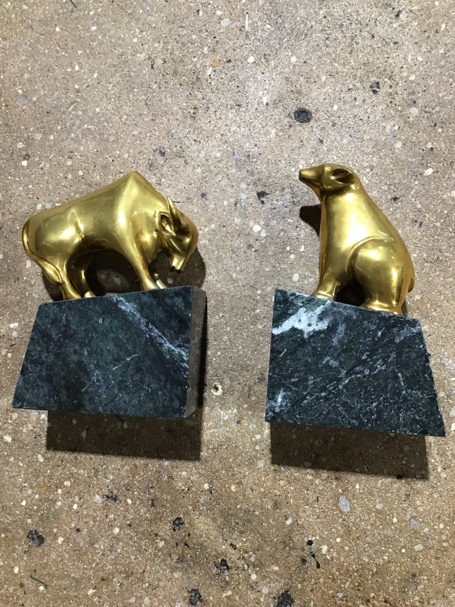 Brass Bull and Bear Bookends with Marble Base 3"Wx 5" D x 8" H