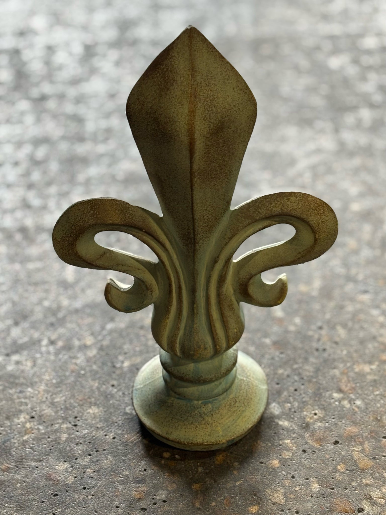 Decorative fleur de lis, faux verdigris, 7.5"W x 4"D x 12"H