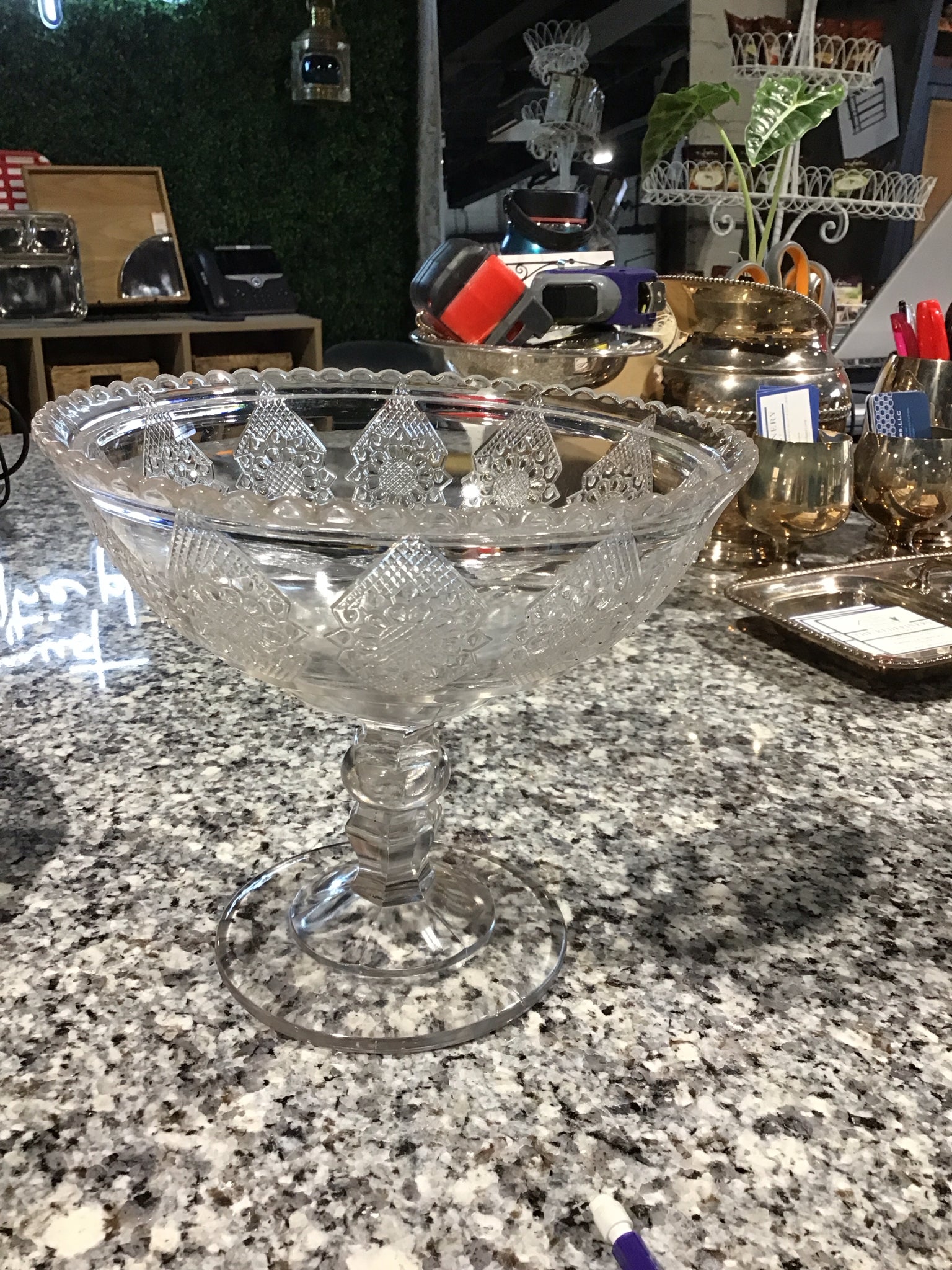 Depression glass footed candy bowl 7" H 8" diameter