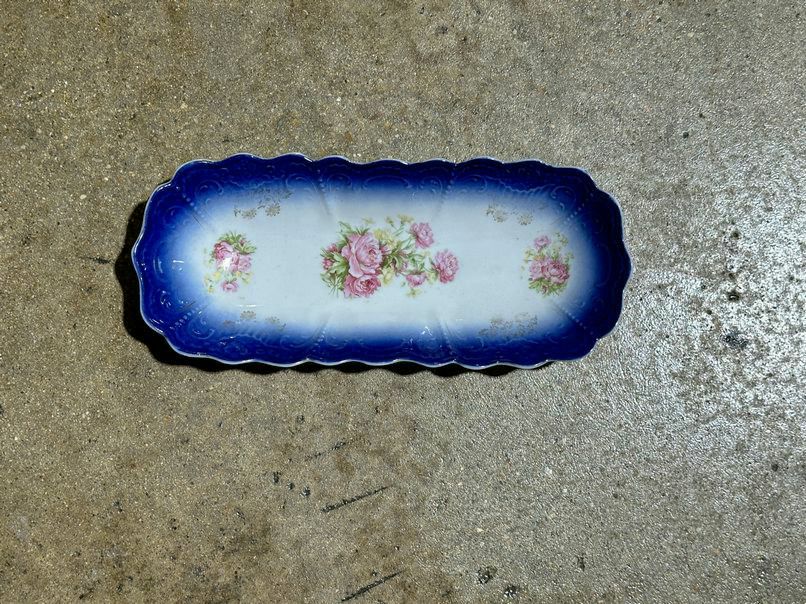 English Pansy/Peony Pattern dish, cobalt blue/gold accents,12"l x 5"w x 2"h
