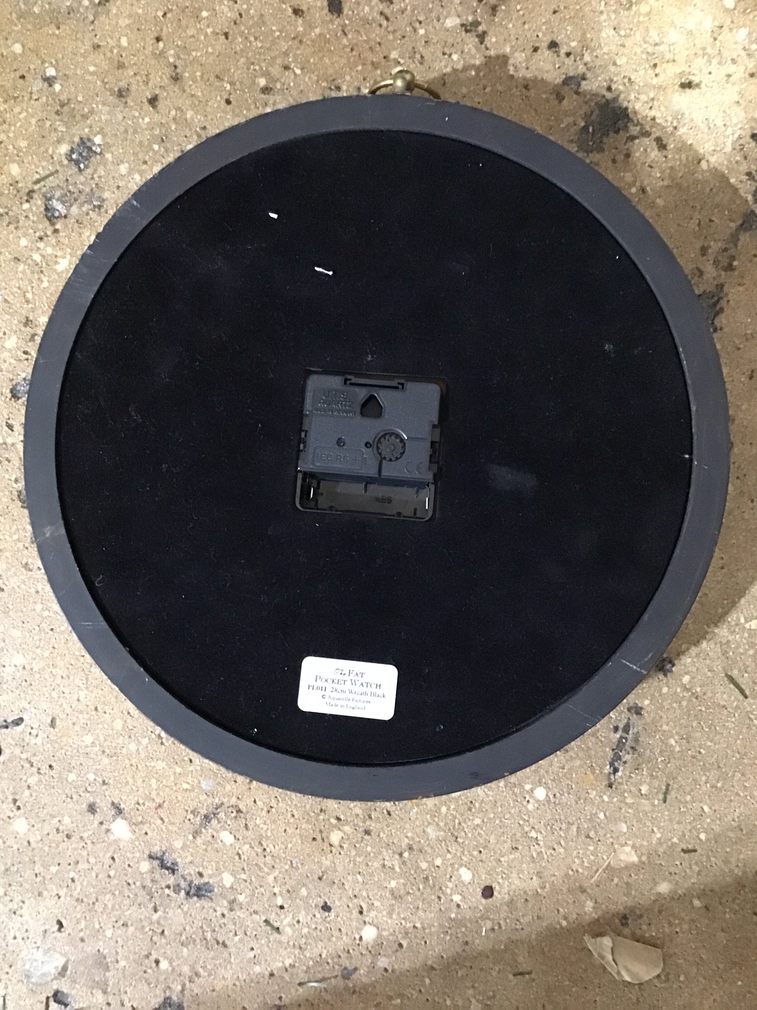 Faux French Charles X Tole Clock- Black/ Gold 10.5 dia.