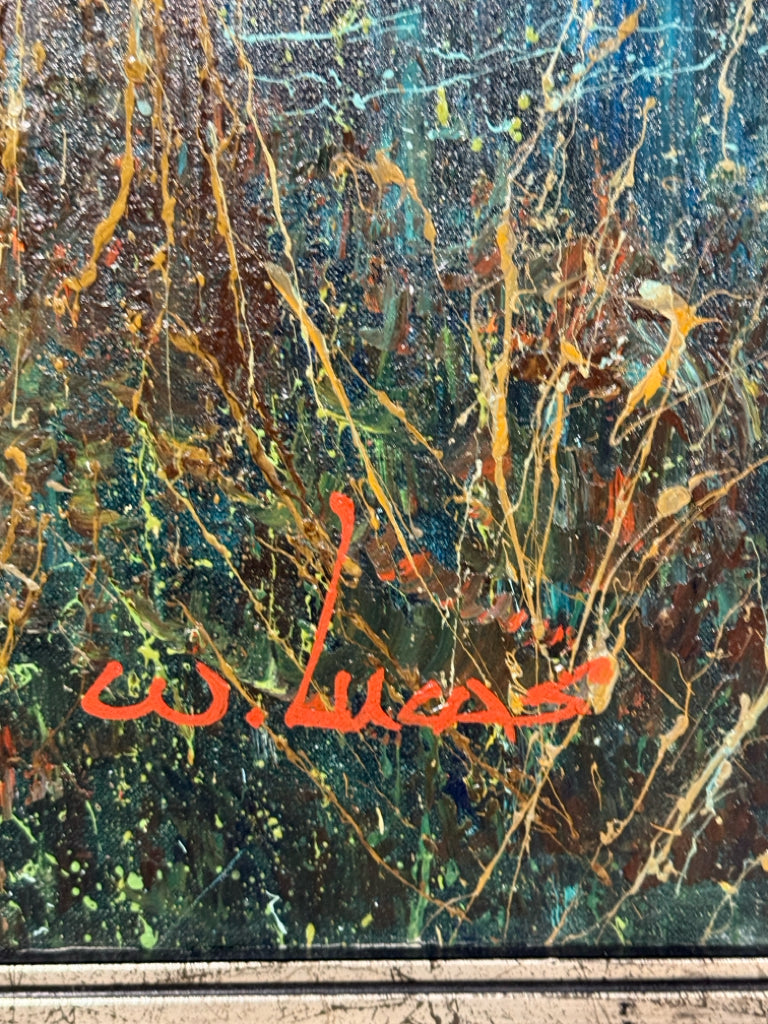 MCM signed W. Lucas oil painting, 37.5"W x 37.5" H x 2"D