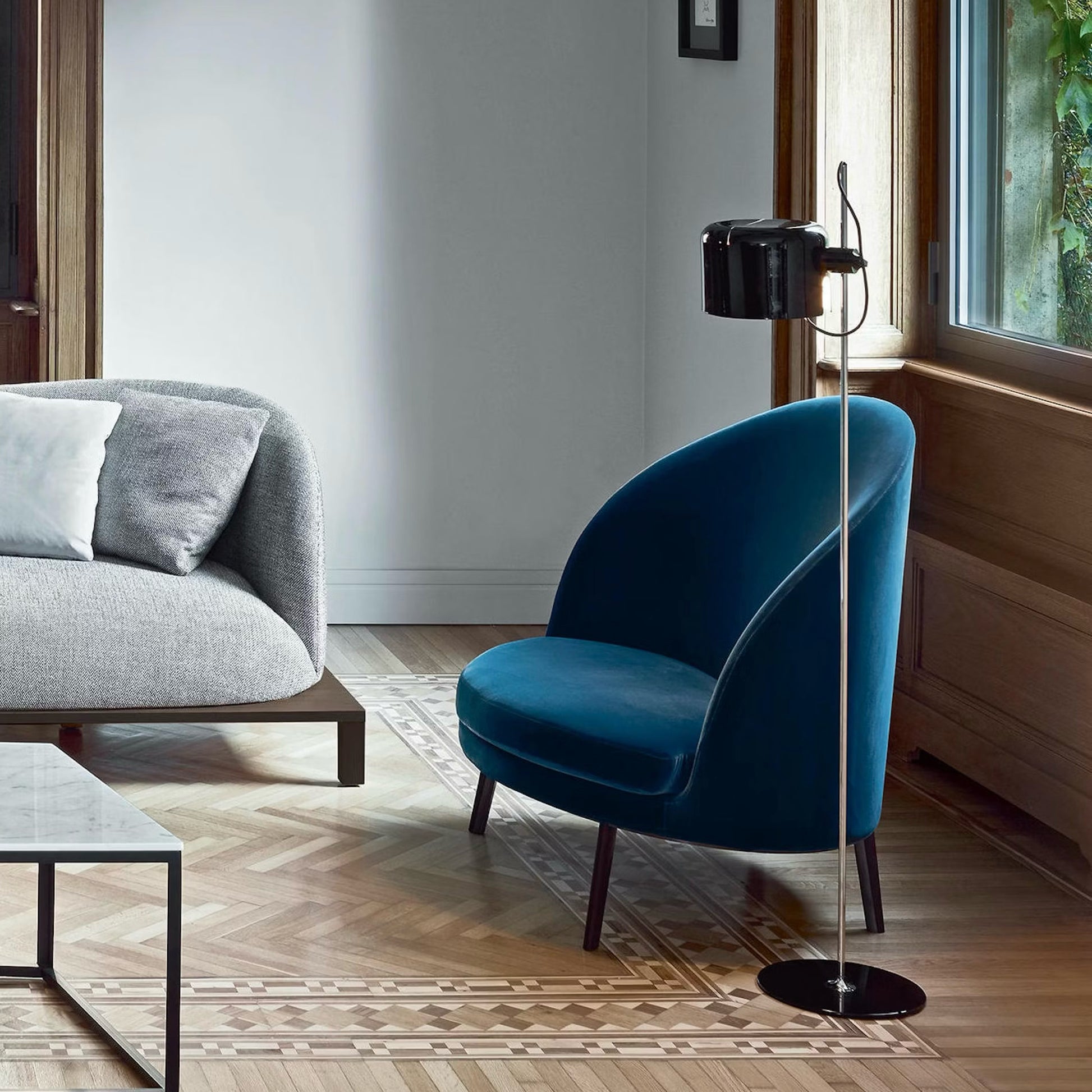 Oluce Coupè Floor Lamp, Lacquered Black & Chrome, 11" Dia x 58" H