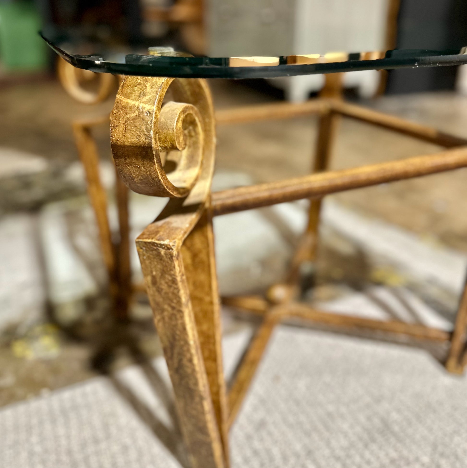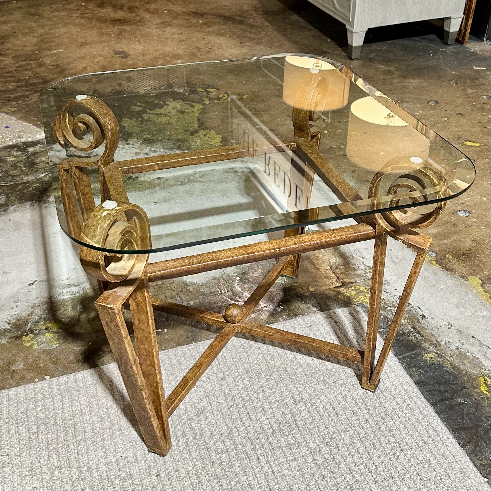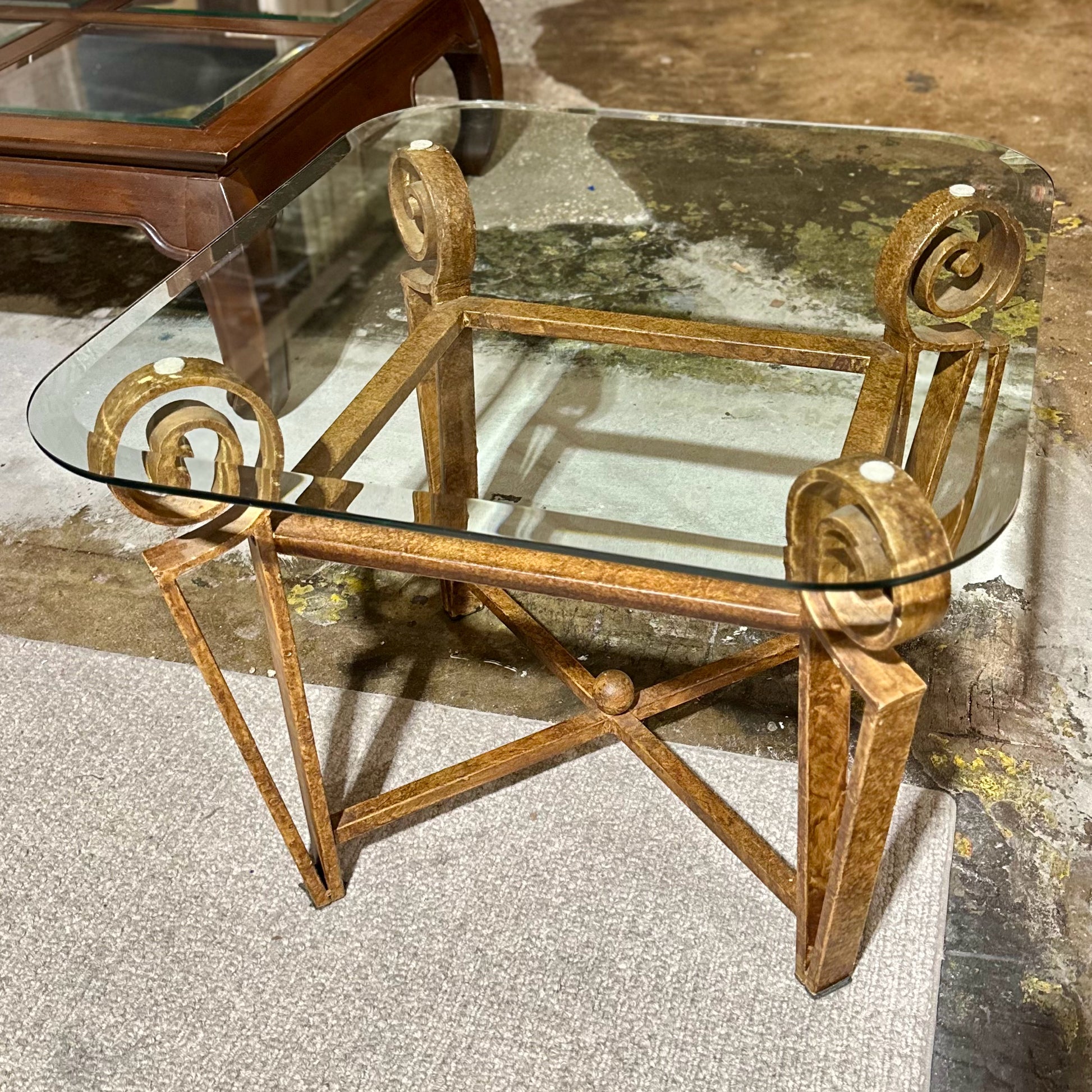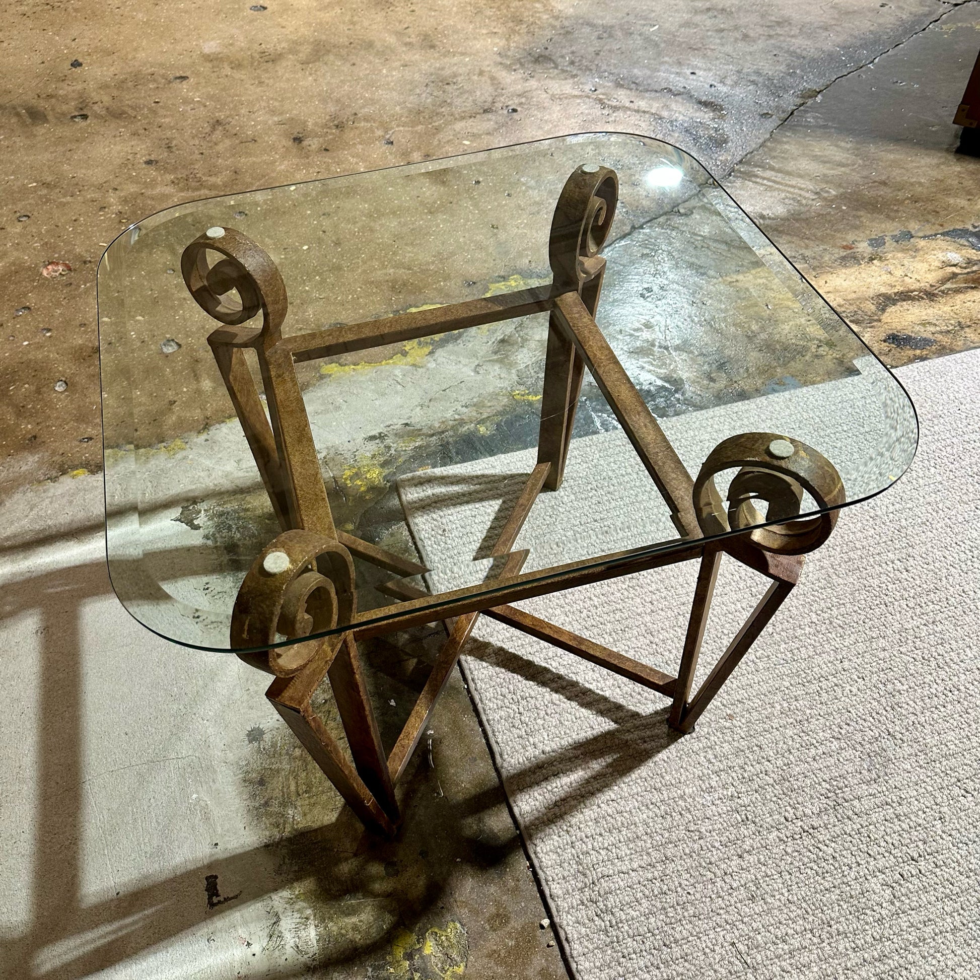 Rounded Edge Glass Top SideTable, Rustic Metal Scroll Base, 28"L x 26"W x 21"H