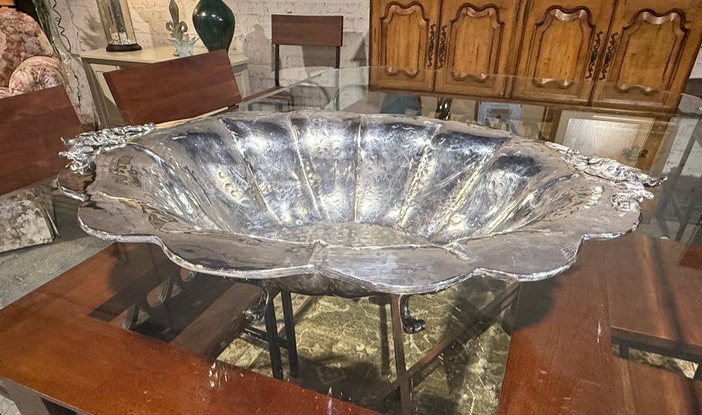 Vintage Baroque footed bowl, silverplate, 22"W x 15.5"D x 5"H