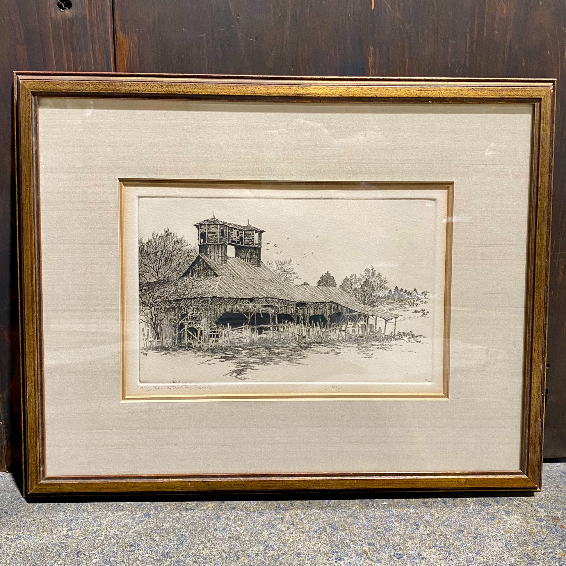 Vintage Etching, Barn w/ Twin Silos, By Little, 19.5"W x 15.5"H x 1"D
