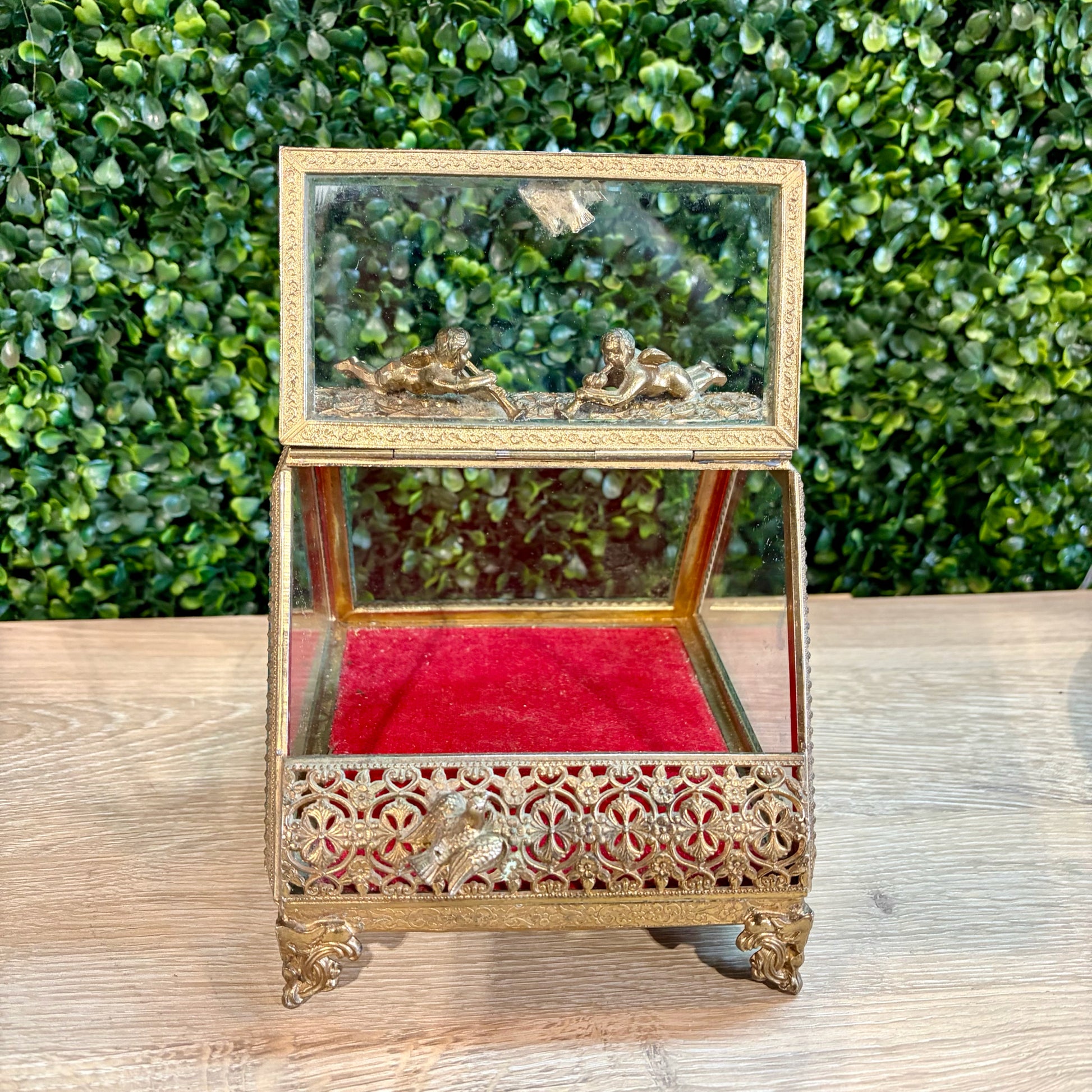 Vintage Filigree & Glass Jewelry Casket/Trinket Box, 5.5"W x 6"D x 5.75"H