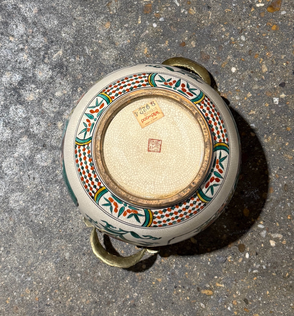 Vintage Japanese Kutani ginger jar w/brass handles,finial, 10"W x 10"D x 12.5"H