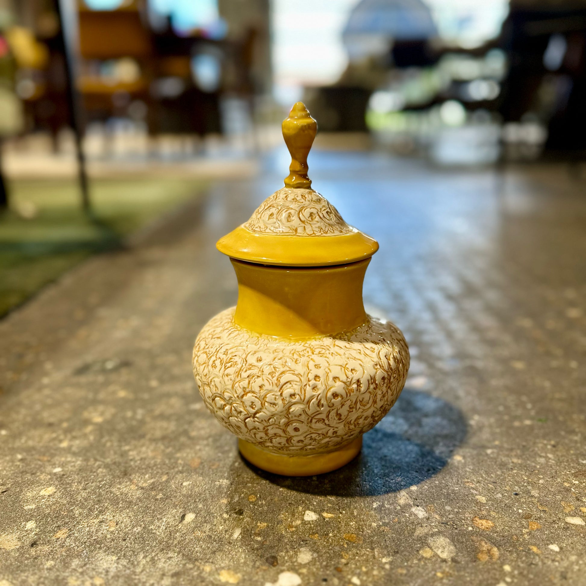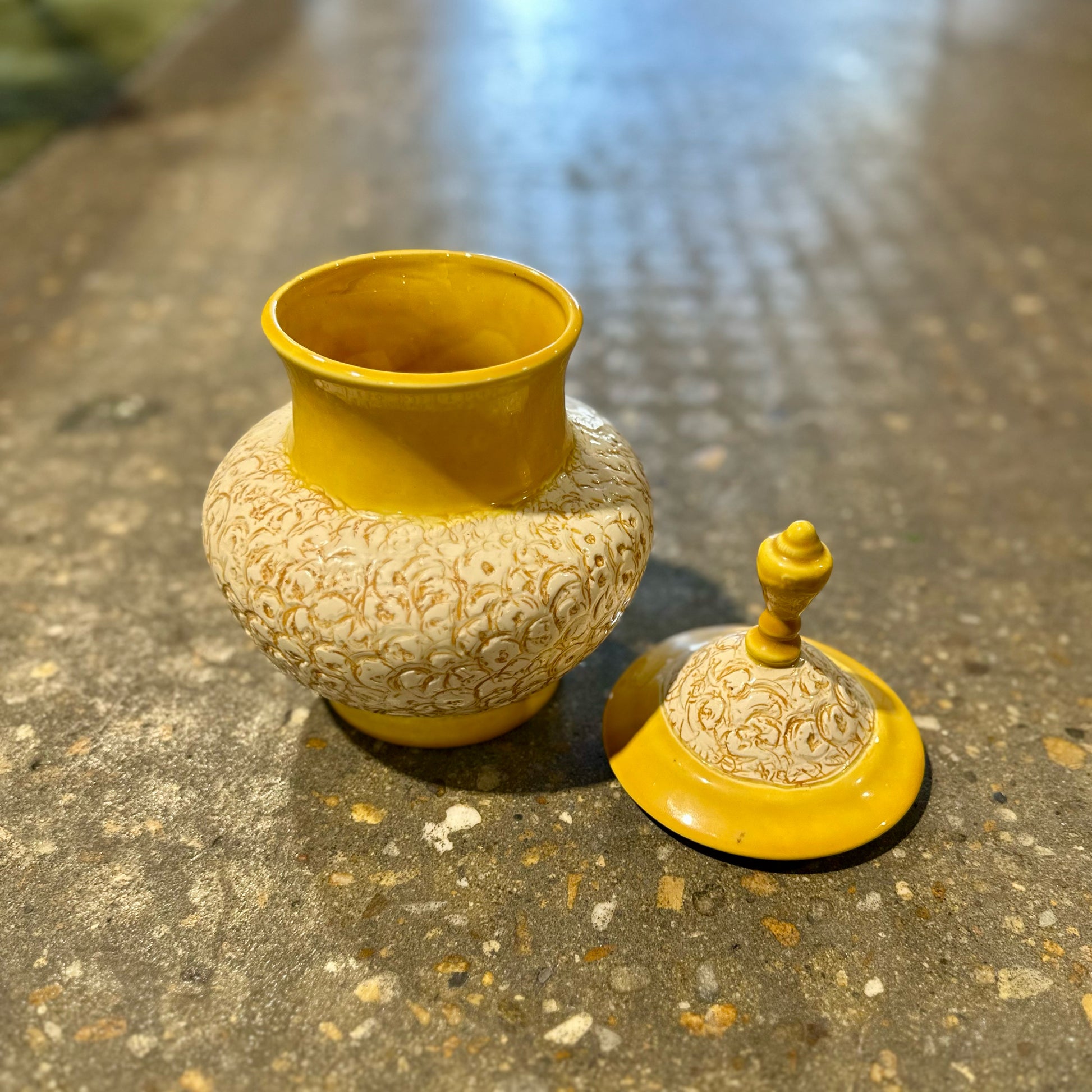 Vintage Lidded Urn, Yellow Ceramic, 6.25" Dia x 10" H