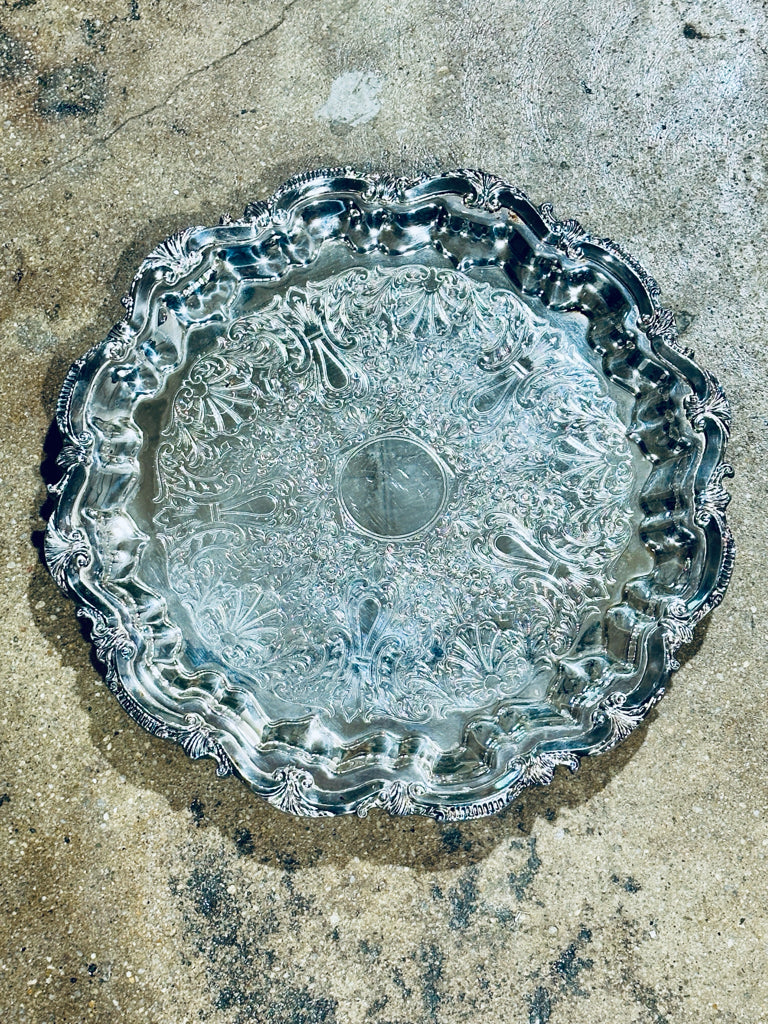 Vintage Silverplate Serving Tray, Etched W/Baroque Edge, 17"Dia