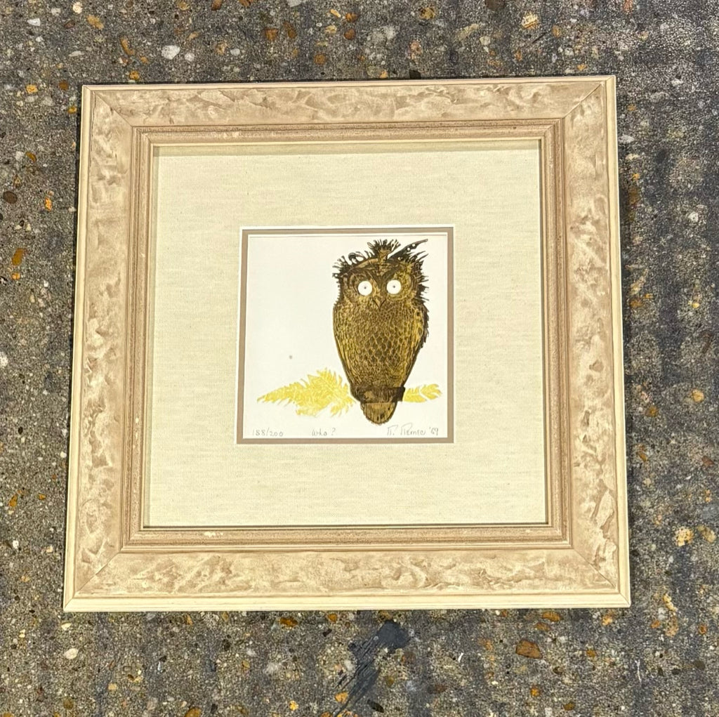 "Who?" 1969 Owl Block Print, Signed & Numbered, Wood Framed, 16.5" W x 16.5" H